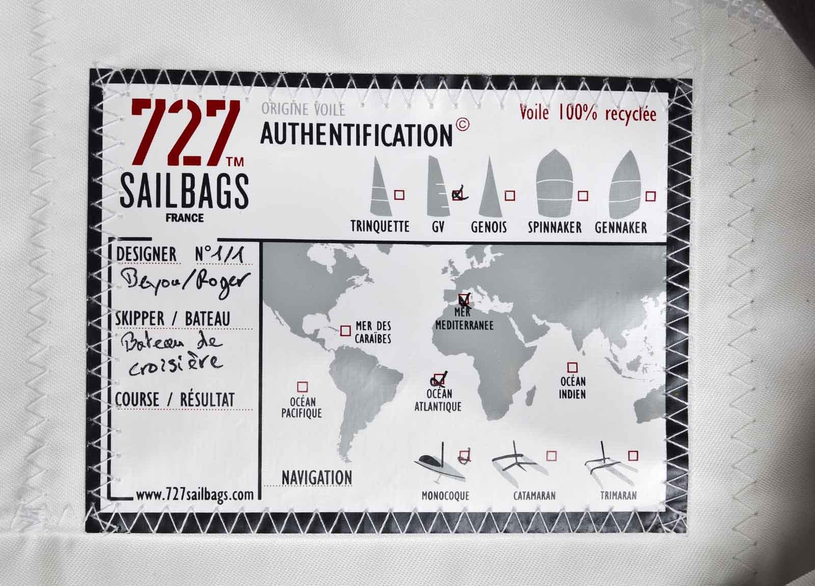 In 727Sailbags workshop in Lorient, Brittany, sails are collected every day. Through these sails, singular stories of navigations. Each sail has its own story, and you can learn about it on the authentication sheet that you can find on most of our products. By giving a second life to the these sails, we commit for the preservation of the environment.